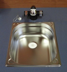 Gastro- Spüle 60x60cm mit Unterbau. Verwenden Sie doch eine Spüle ohne Abtropffläche, dann sparen Sie ein wenig mehr Platz. Diese Fläche können Sie mit anderen Produkten wie einem separaten Ständer zum Abtropfen des Geschirrs an anderen Stellen arrangieren.